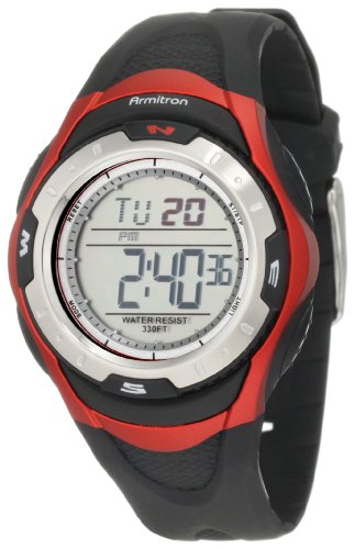 The Armitron Women's Chronograph Black and Red Digital Sport Watch is a superior athletic accessory that features durable construction, along with lap, countdown, and dual alarm functions. Designed with a lightweight black resin case, the watch includes a stainless steel ratchet bezel showcasing the cardinal directions, and a black resin wristband secured with a buckle clasp. A durable mineral window shields the digital gray dial, which features the time along with a day and date display. Four black side buttons control the alarm, EL display, chronograph, lap, and countdown timer functions, as well as switch the display to military time. Powered by quartz movement, the watch is water resistant to 330 feet (100 M).